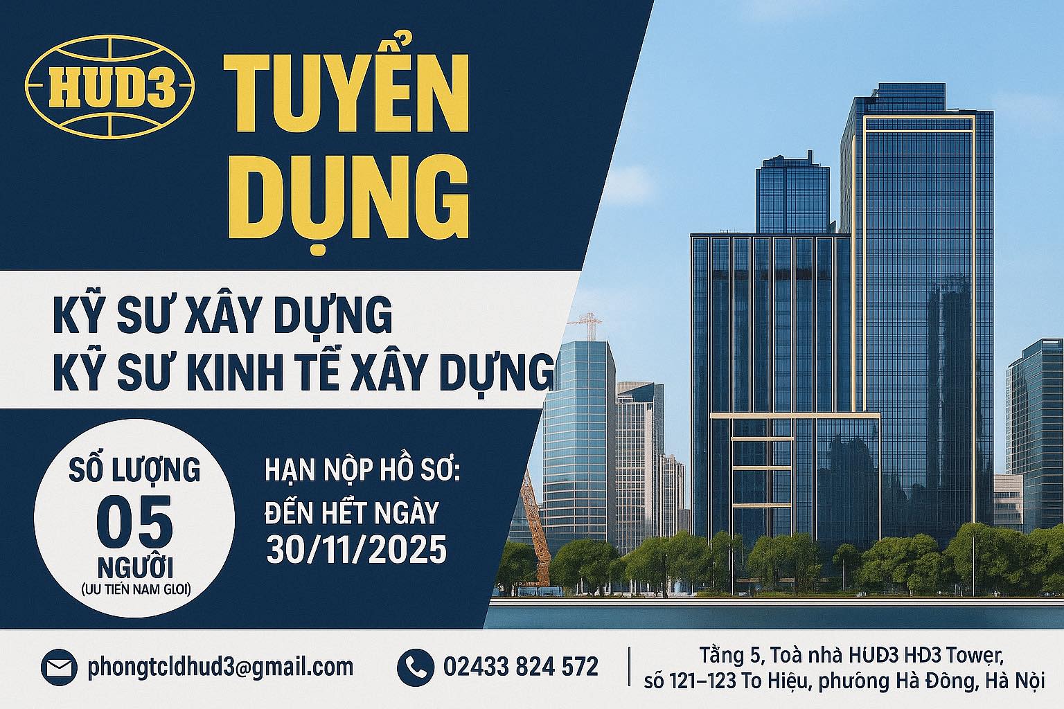 Công ty cổ phần đầu tư và xây dựng HUD3 tuyển dụng 05 cán bộ kỹ thuật làm việc tại Công ty và các công trình xây dựng.