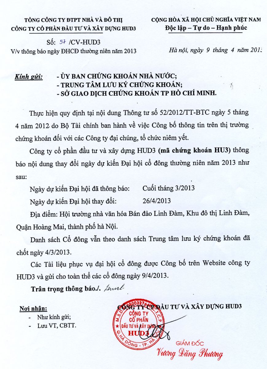 Công ty HUD3 có công văn gửi Ủy ban CK nhà nước, Trung tâm lưu ký chứng khoán và sở SGCK TP Hồ Chí Minh về việc thay đổi ngày Đại hội cổ đông thường niên 2013