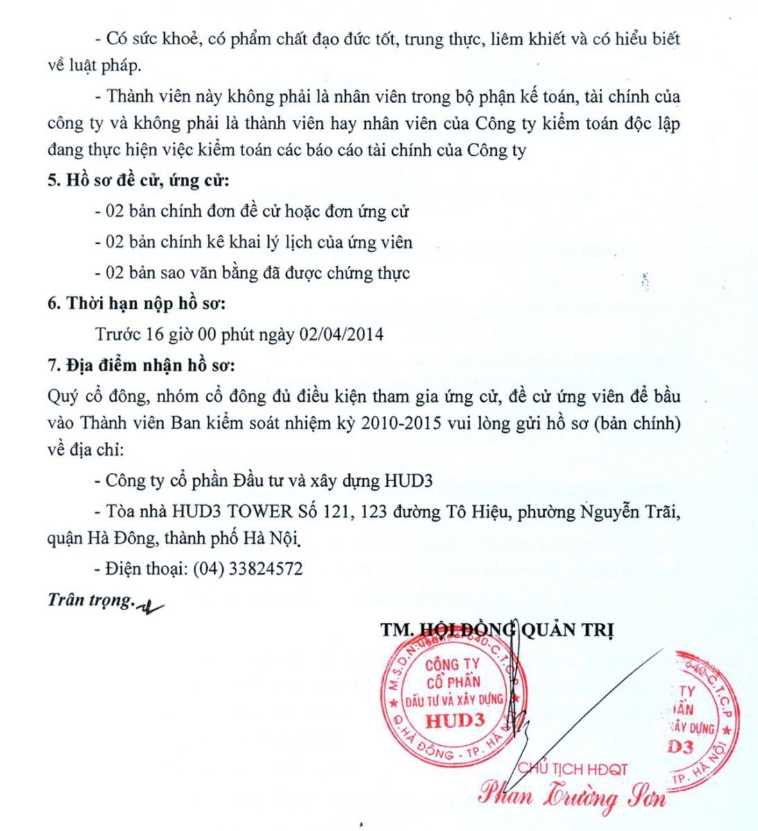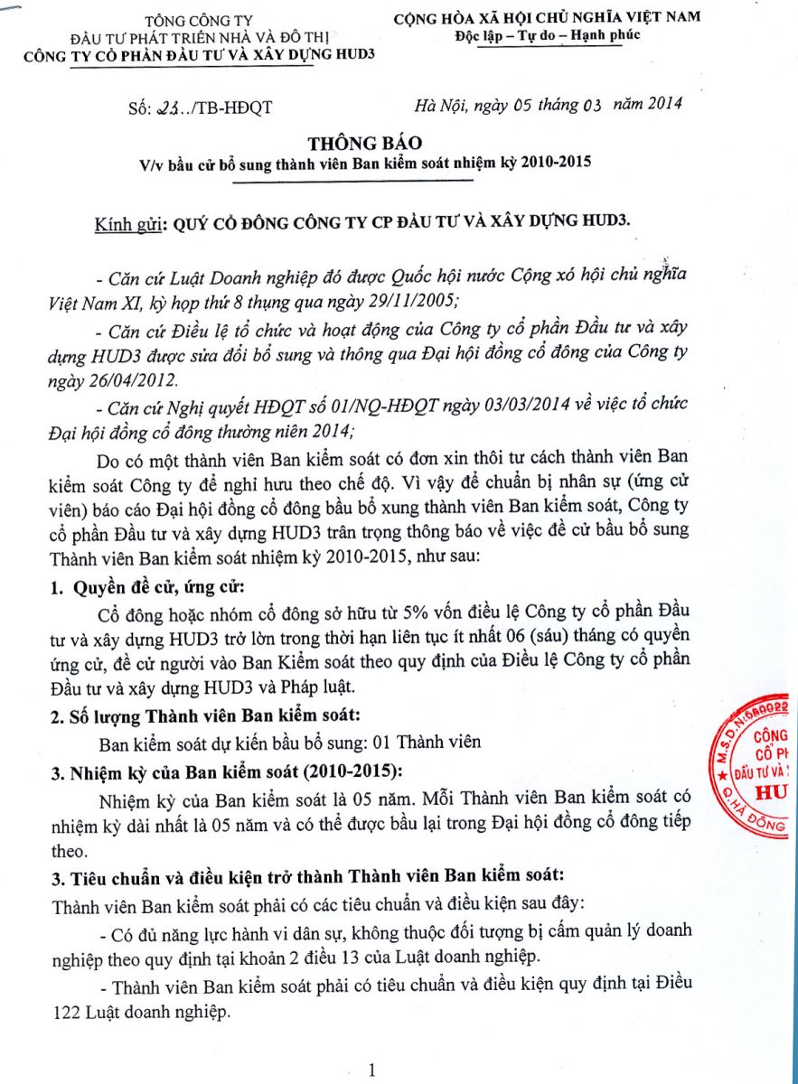 Công ty CP đầu tư và xây dựng HUD3 (mã chứng khoán HU3) dự kiến bầu bổ sung thành viên ban kiểm soát nhiệm kỳ 2010-2015 tại Đại hội cổ đông thường niên 2014. Dưới đây là thông báo của Hội đồng quản trị về việc ứng cử vào vị trí thành viên ban kiểm soát.